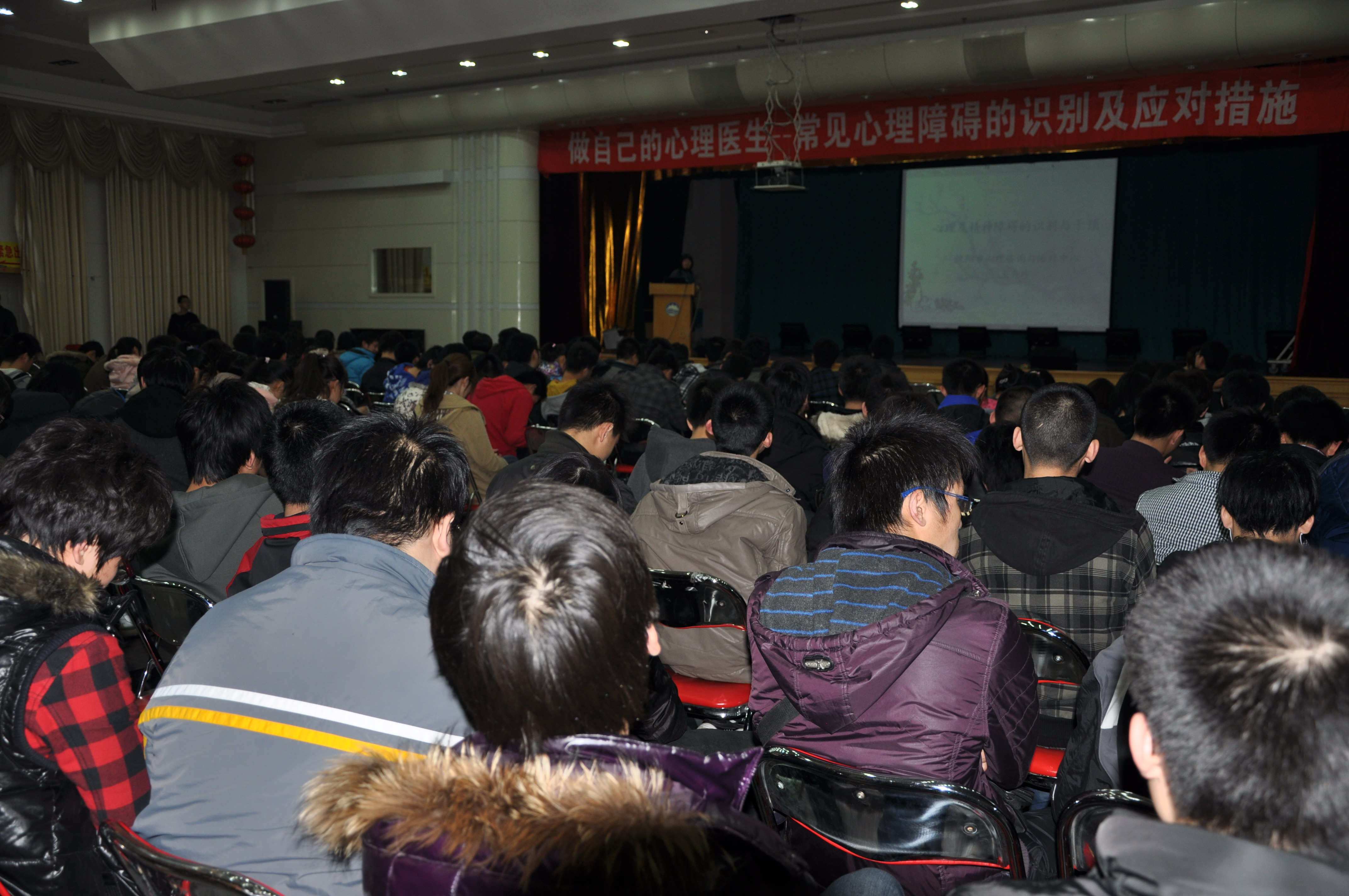 “做自己的心理医生”——常见心理障碍的识别及应对措施讲座,于2012年3月21日在我校大活多功能厅顺利举行。本次讲座是我校学生指导服务中心心理健康教育中心主办的“心理健康宣传月”系列活动之一,面向全体在校生开展。
