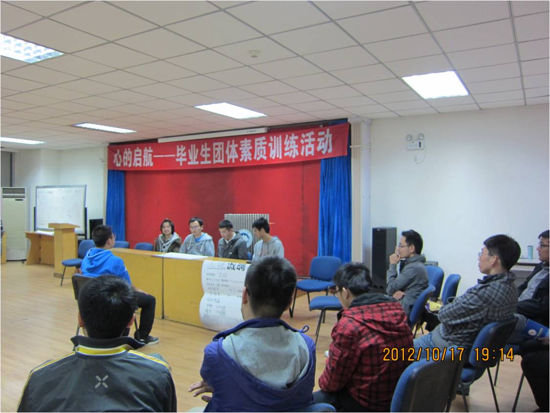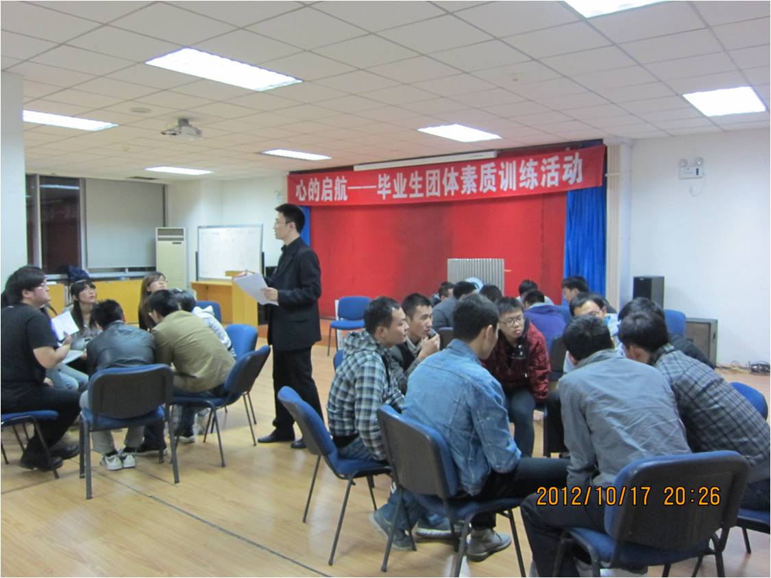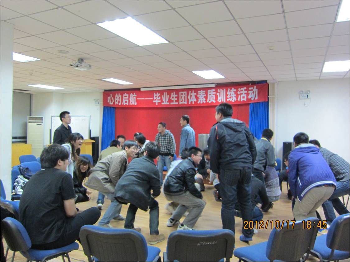 10月17日晚,心理健康教育中心在学生活动中心300室开展了毕业生就业指导团体素质训练活动,来自机械学院2009级部分毕业生参与了这项别开生面的活动。