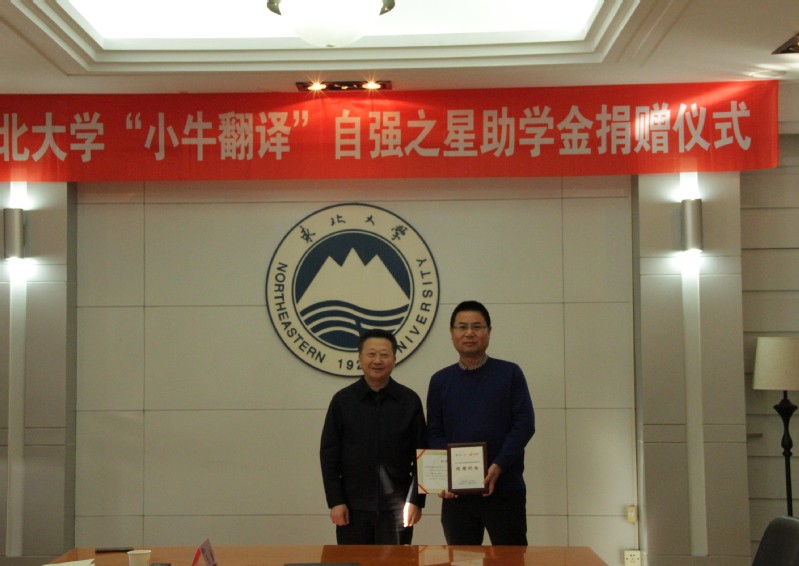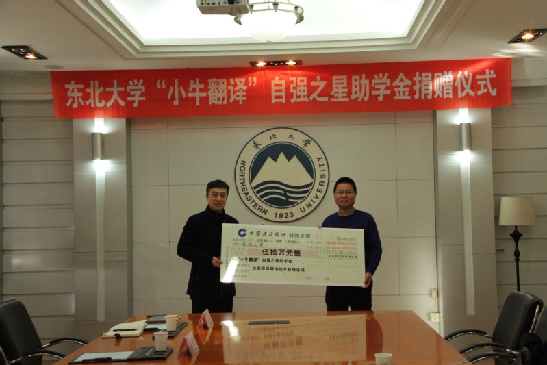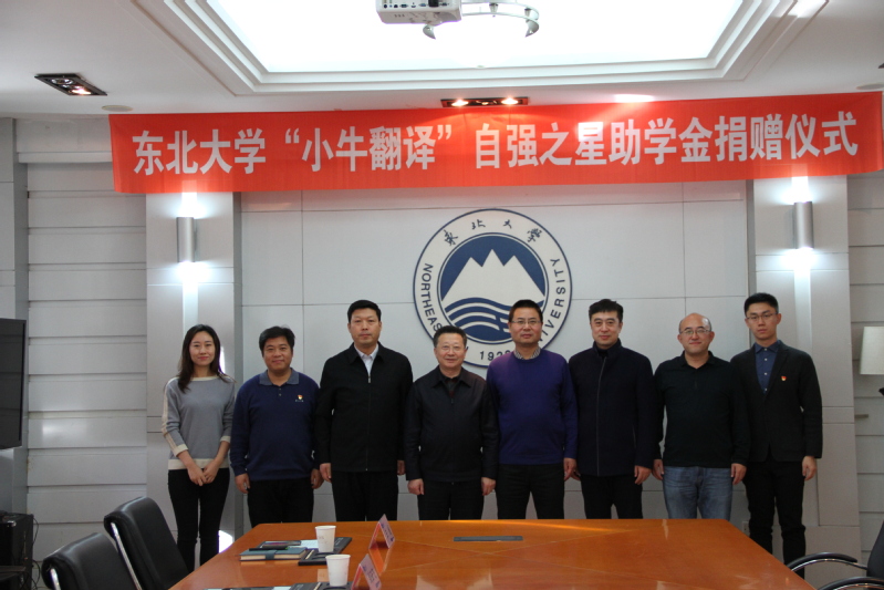 11月27日,东北大学“小牛翻译”自强之星助学金捐赠仪式在学生活动中心206举行。东北大学党委副书记张国臣、对外联络与合作处处长李鹤、学生指导服务中心主任刘云飞、小牛翻译创始人/董事长朱靖波、总裁张春良出席,学生指导服务中心副主任石昌远主持捐赠仪式。