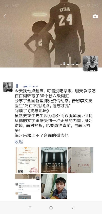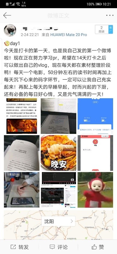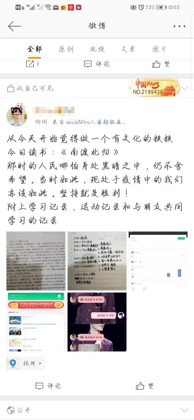 打卡活动内容丰富,包括自我实现、正能量分享、人际交往等7大类,从专业知识到兴趣爱好、从亲情到友情、从传统文化到现实生活,覆盖了假期生活的方方面面。同学们每日在QQ空间、微信朋友圈、微博等平台通过打卡的形式参与活动并获得每日提升自我的分数。通过每日打卡,同学们可以养成良好的作息规律、习得救急技能、增进厨艺,也可以感受书香韵味、塑造良好体态,甚至在学业上突飞猛进。参与活动的同学们纷纷反馈,经过两周的坚持,欣喜地发现了自己的变化,收获了贵在坚持的信念,并且对未来的生活多了一份自信。这次的疫情没有击垮我们,反而让我们有了勇往直前的必胜信心!