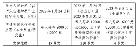 对应征入伍服义务兵役、招收为士官的高校学生,在入伍时对其在校期间缴纳的学费实行一次性补偿或用于学费的国家助学贷款实行代偿。