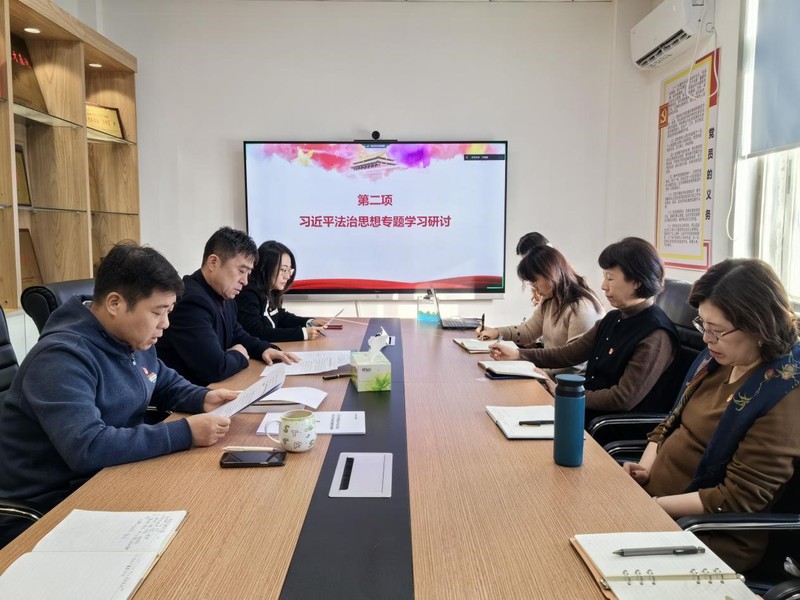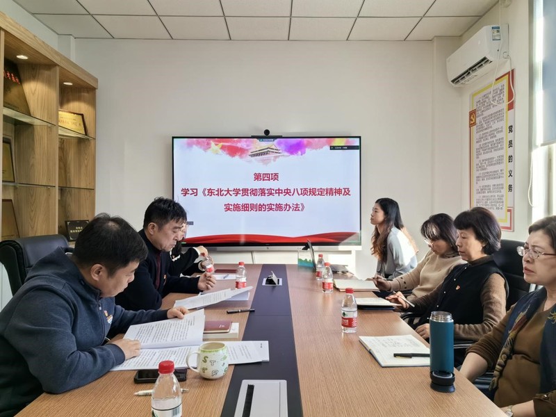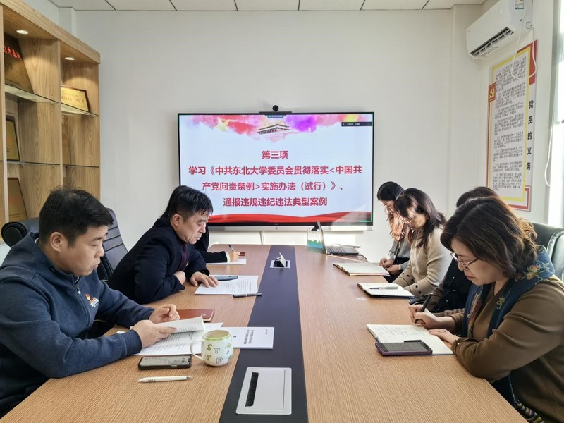 党支部有关同志领学了习近平法治思想相关学习内容,对《中共东北大学委员会贯彻落实<中国共产党问责条例>实施办法(试行)》进行了解读。石昌远通报了有关违规违纪违法典型案例,传达了《东北大学贯彻落实中央八项规定精神及实施细则的实施办法》内容。会前,党支部编制并向全体同志发放了习近平法治思想等专项学习材料。