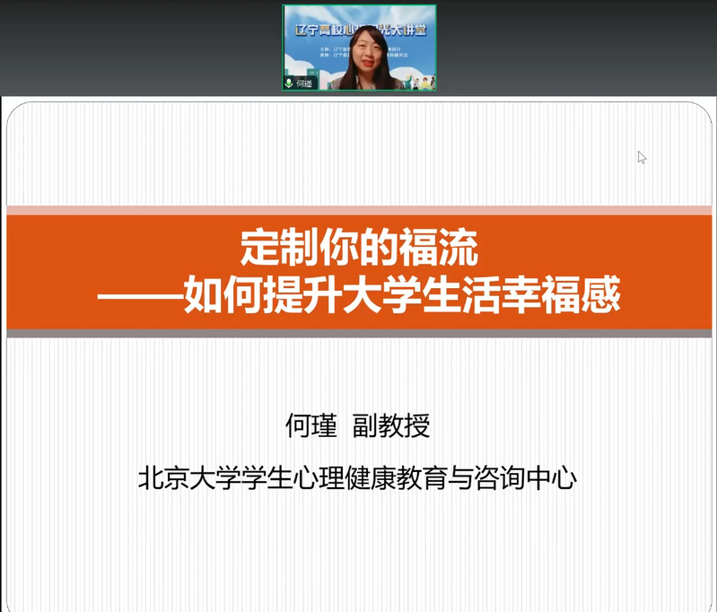 4月24日,由辽宁省委教育工委、省教育厅主办,辽宁省高等学校心理健康教育研究会承办的“辽宁高校心理阳光大讲堂”第十五期讲座在线上举办,东北大学组织并主持本次活动。北京大学学生心理咨询中心何瑾副教授作题为《定制你的福流——如何提升大学生活幸福感》讲座,2万余名省内高校师生在线观看。