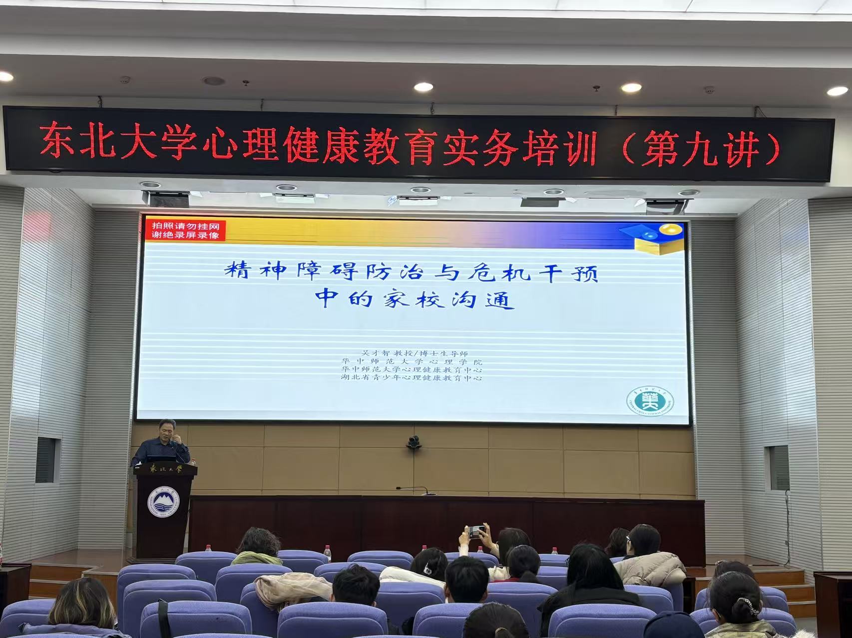 12月4日下午,由学生指导服务中心主办的东北大学心理健康教育实务培训(第九讲)在主楼822室举办。教育部全国学生心理健康工作咨询委员会委员、华中师范大学吴才智教授以“精神障碍防治与危机干预中的家校沟通”为题,为我校学生工作干部作专题报告。